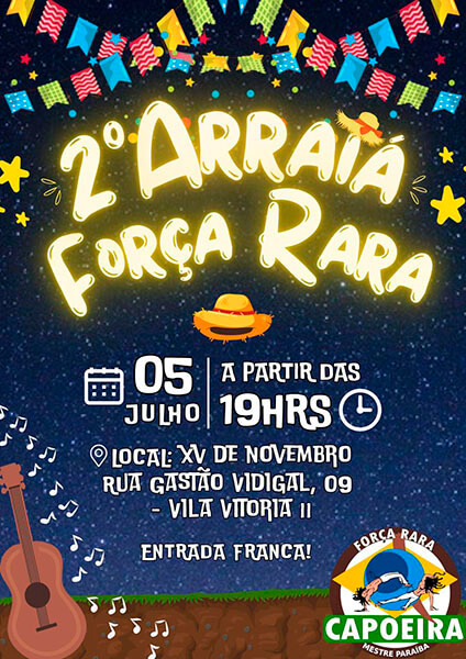 O projeto Força Rara realiza a segunda edição do “Arraiá Força Rara”, neste sábado (5/7), a partir das 19h, no salão do Clube XV de Novembro, localizado na Rua Gastão Vidigal, 09, Vila Vitória 2, em Indaiatuba. O evento contará com comida típica, música ao vivo e muita diversão. A entrada é gratuita.