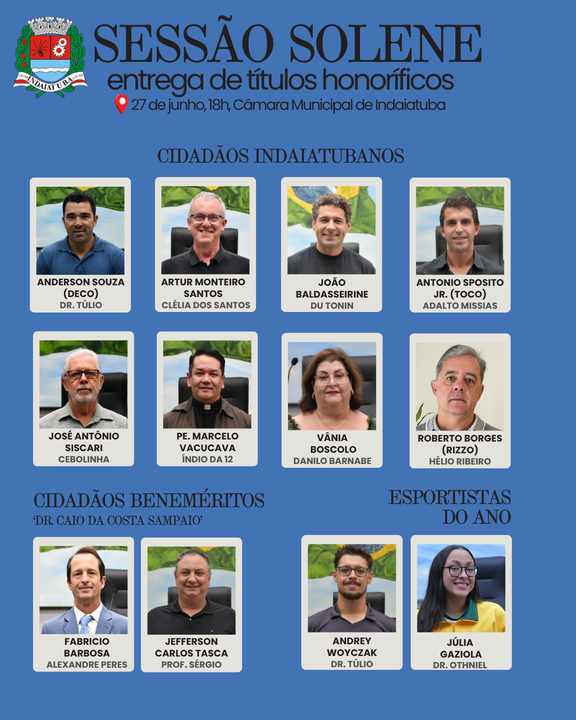 A Câmara de Indaiatuba promove no dia 27 de junho a primeira sessão solene de 2025 – solenidade que marca a entrega dos títulos de Cidadão Indaiatubano, Cidadão Benemérito ‘Dr. Caio da Costa Sampaio’ e Esportista do Ano. Os títulos foram aprovados em plenário por unanimidade ao longo do primeiro semestre, após análise do Departamento de Preservação e Memória da Secretaria de Cultura.